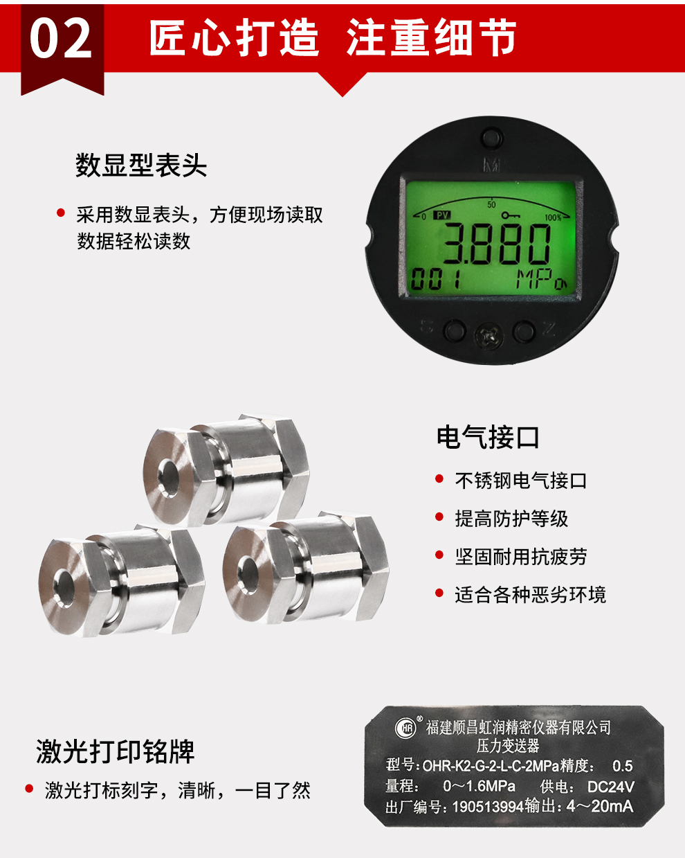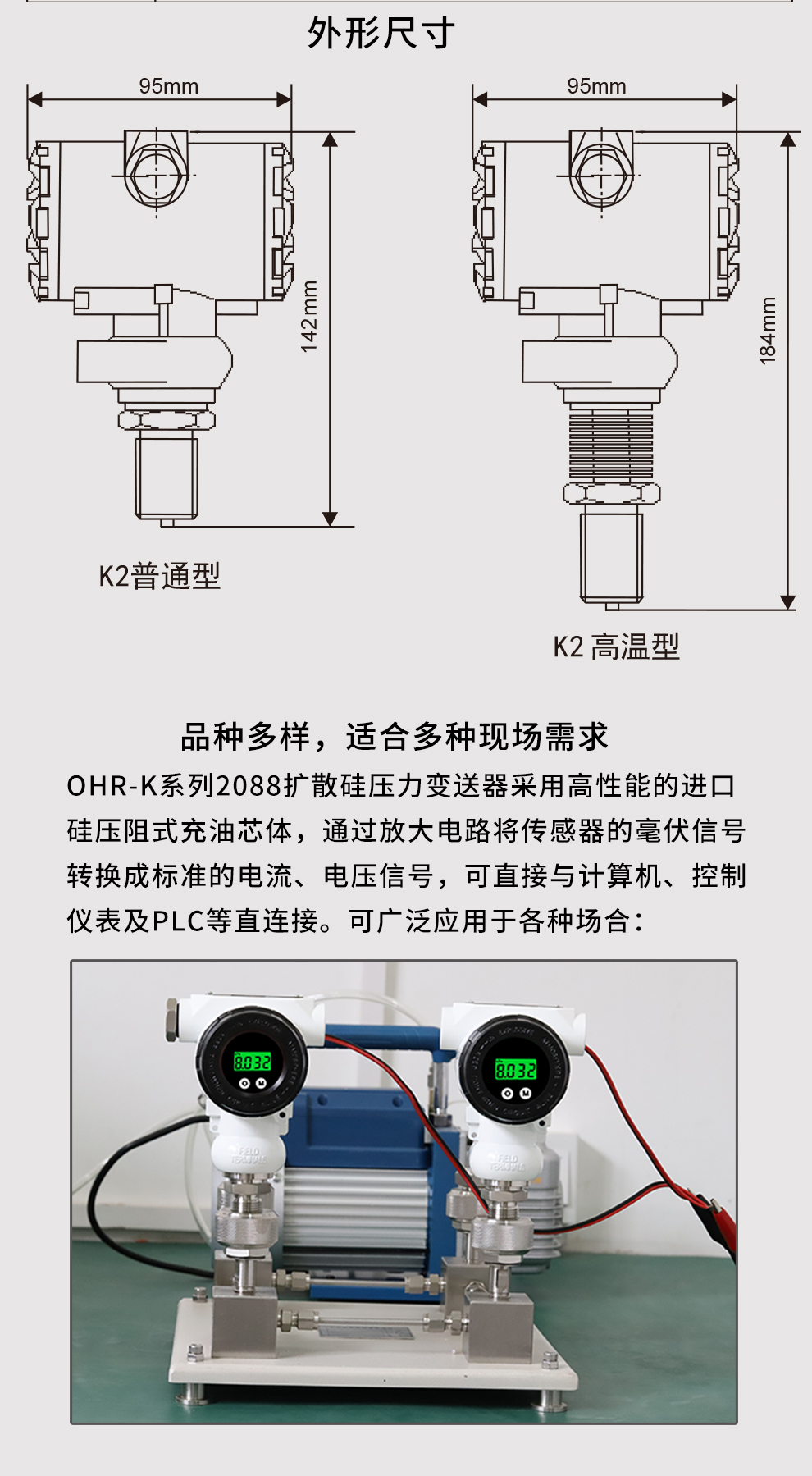 K系列壓力變送器采用具有國際先進(jìn)水平的擴(kuò)散硅傳感器,配合高精度電子元件,經(jīng)嚴(yán)格的工藝過程裝配而成。充分發(fā)揮了傳感器的技術(shù)優(yōu)勢(shì),使該系列壓力變送器具有優(yōu)異的技術(shù)性能。該變送器抗過載和抗沖擊能力強(qiáng)、溫度漂移小、穩(wěn)定性高,具有很高的測(cè)量精度。