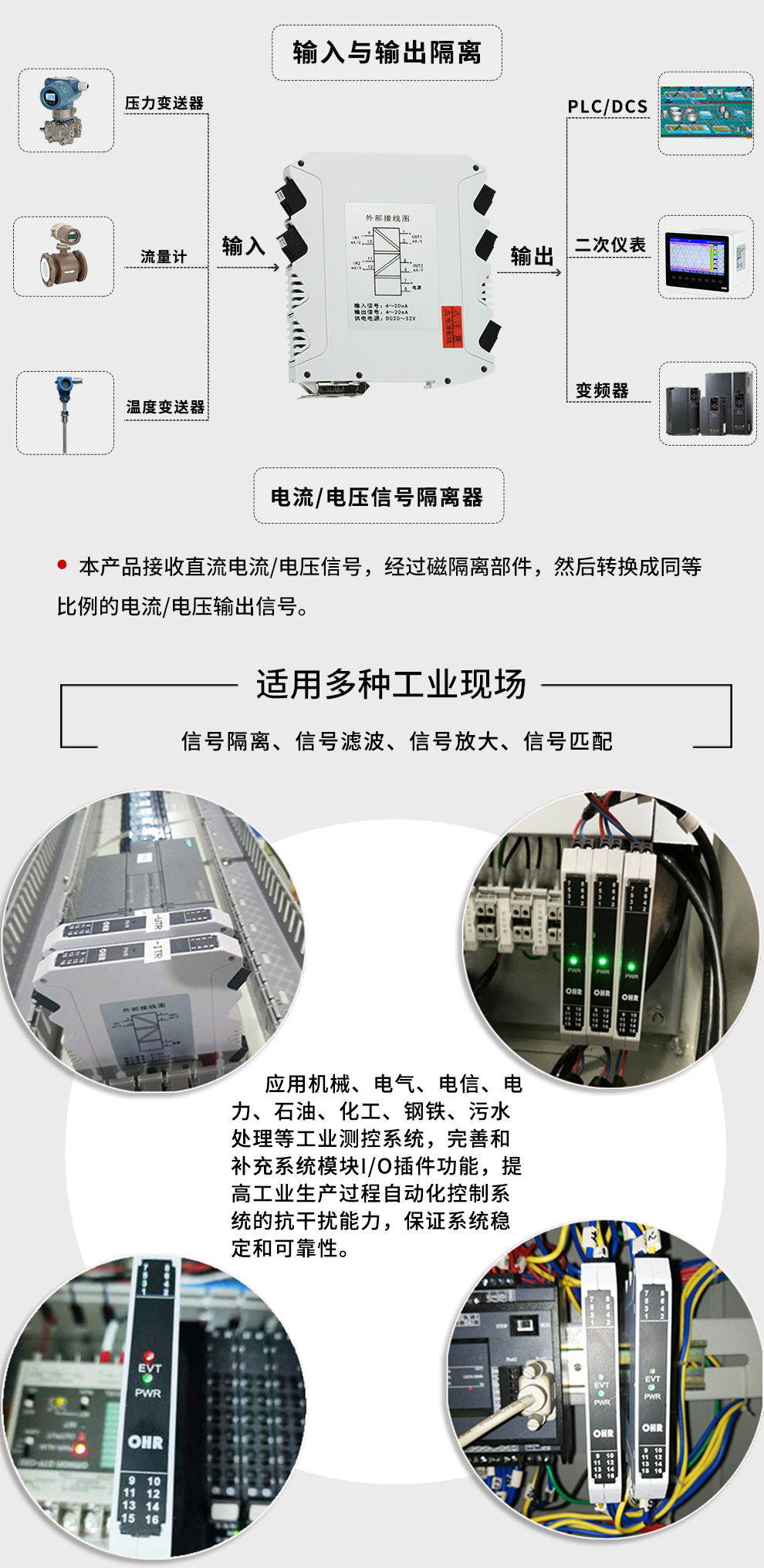 OHR-M21系列電壓/電流隔離器將直流電壓或電流信號經(jīng)過隔離傳送,轉(zhuǎn)換成所需的信號給其它儀表。可以與單元組合儀表及DCS、PLC等系統(tǒng)配套使用,給予現(xiàn)場儀表信號隔離、信號轉(zhuǎn)換、信號分配、信號處理等,從而提高工業(yè)生產(chǎn)過程自動控制系統(tǒng)的抗干擾能力,保證系統(tǒng)的穩(wěn)定性和可靠性。